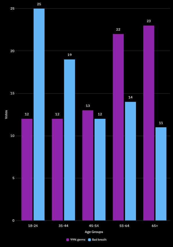 “Kills 99% of germs” is a health message. It speaks to responsibility and long term care. Older consumers are more likely o have experiences tooth or gum issues, and may have heard from their doctors that oral is linked to heart health.
